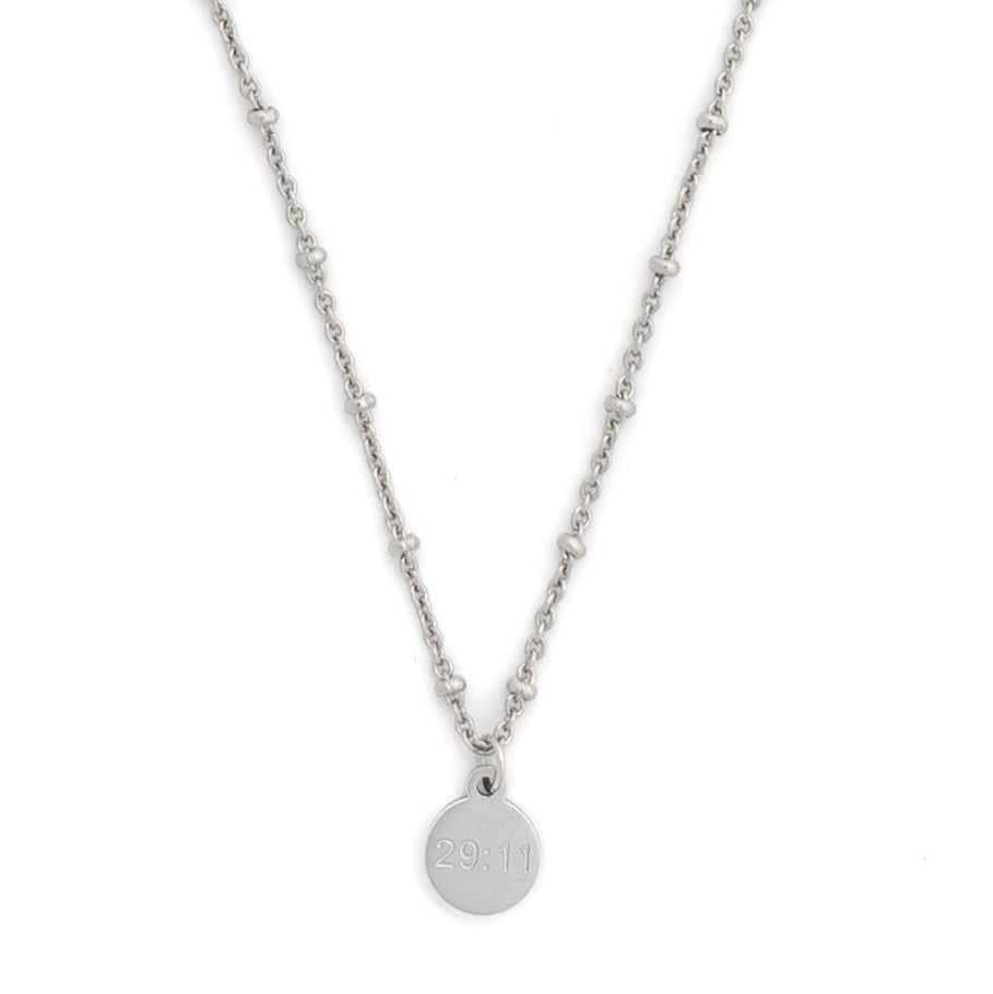 Horizontal Oval disk pendant is 0.59 inches in diameter, engraved with "29:11" on one side