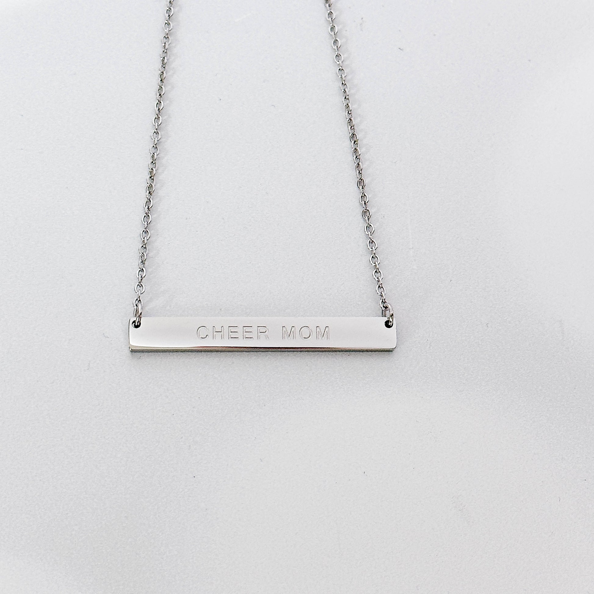 Horizontal bar pendant is 1.5 inches long, engraved with "CHEER MOM" on one side