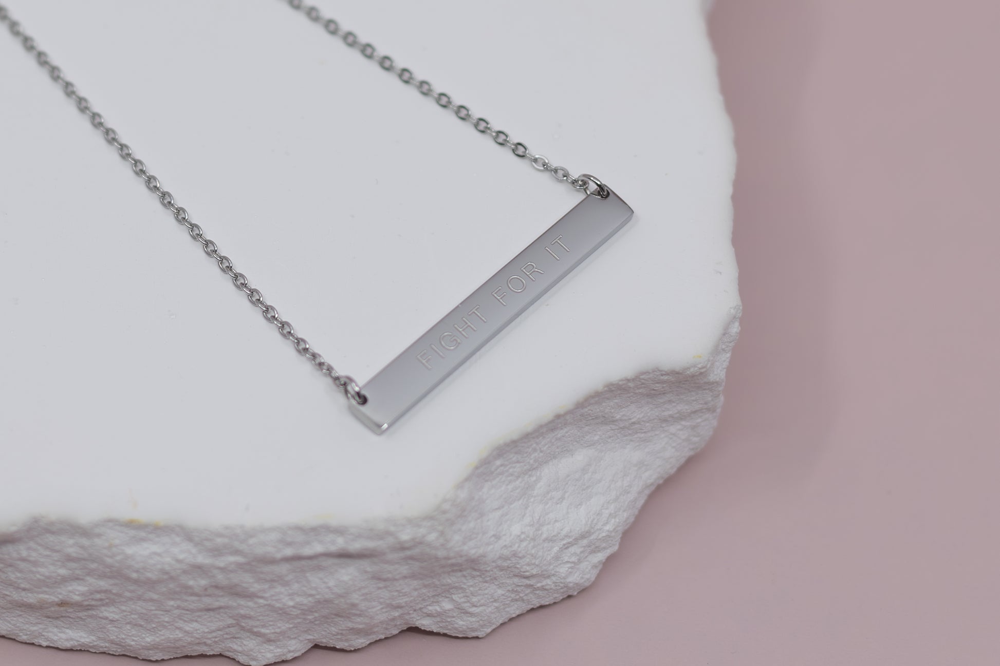 Horizontal bar pendant is 1.5 inches long, engraved with "FIGHT FOR IT" on one side