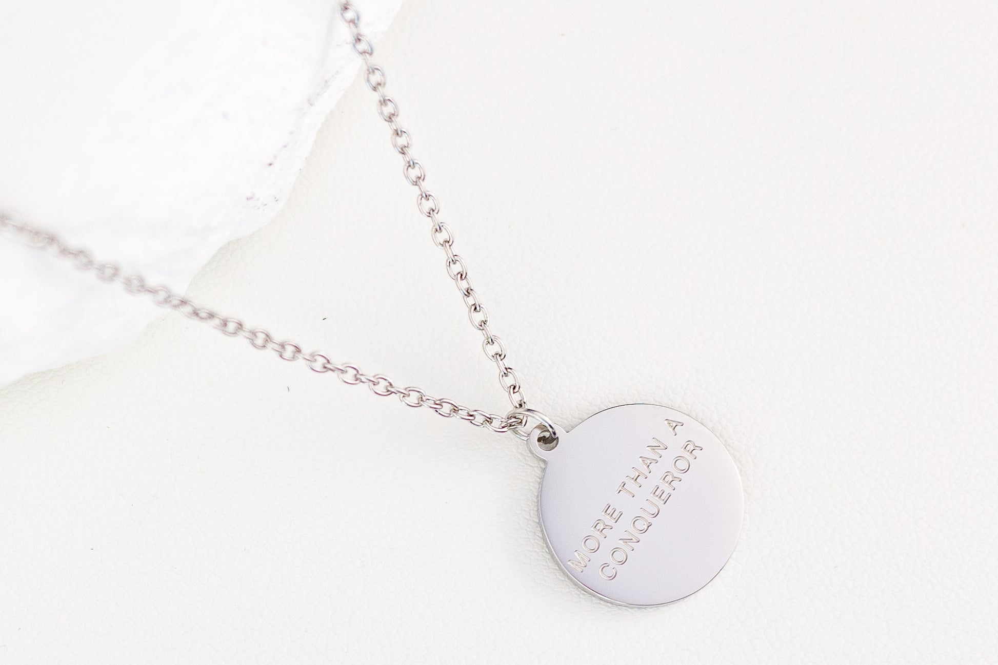 Round disk pendant is 0.59 inches in diameter, engraved with "MORE THAN A CONQUEROR" on one side