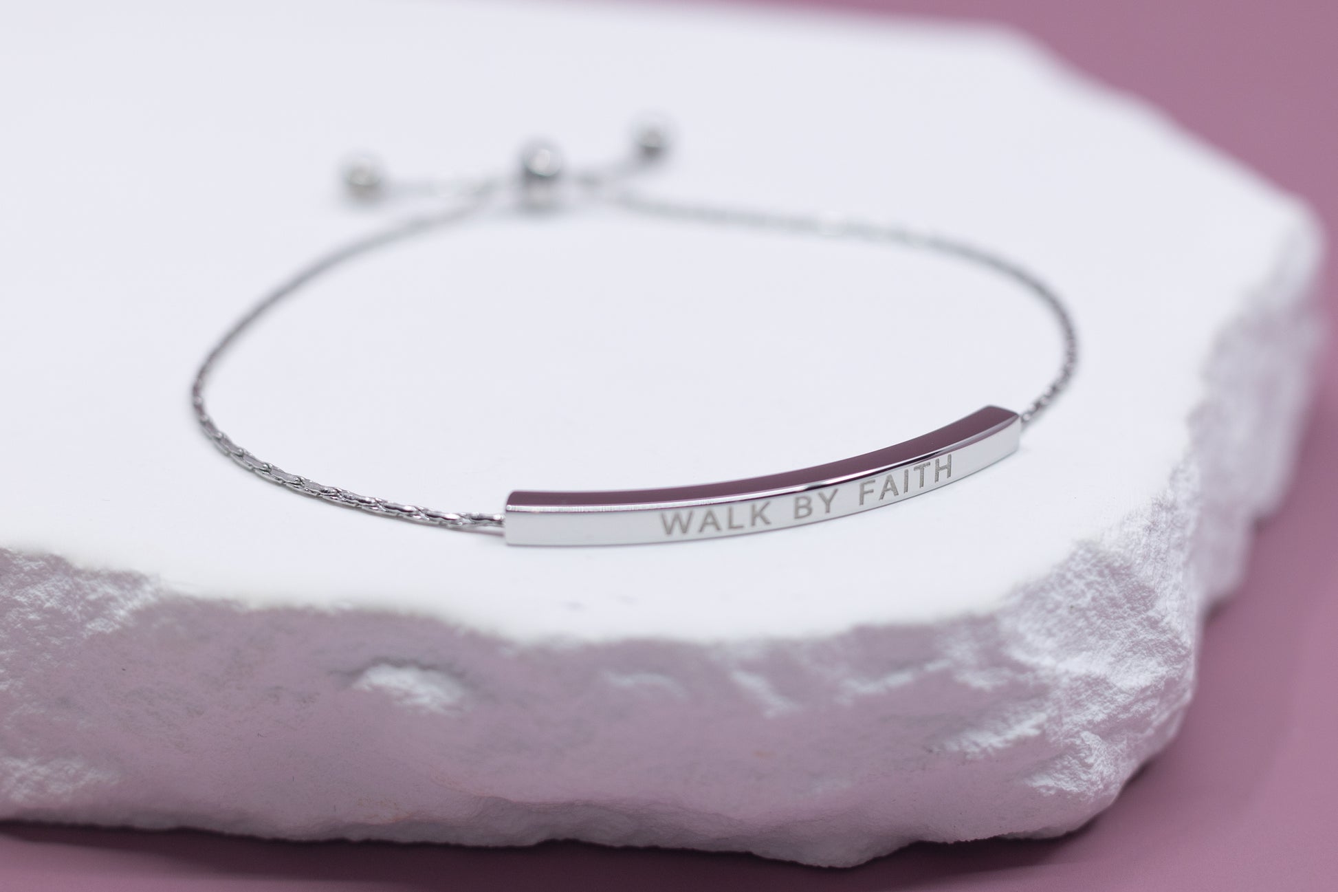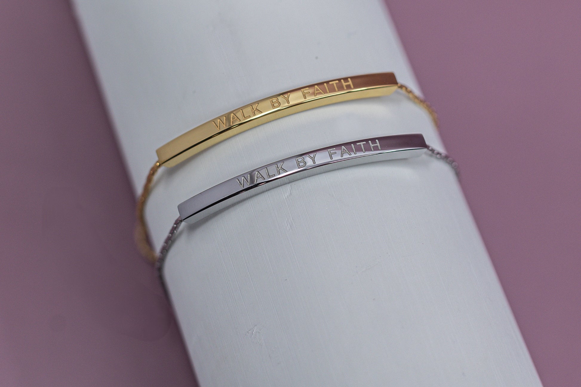 Engraved bar is 1.57 inches long, 0.11 inches thick, 0.11 inches tall, and engraved with "WALK BY FAITH" on one side
